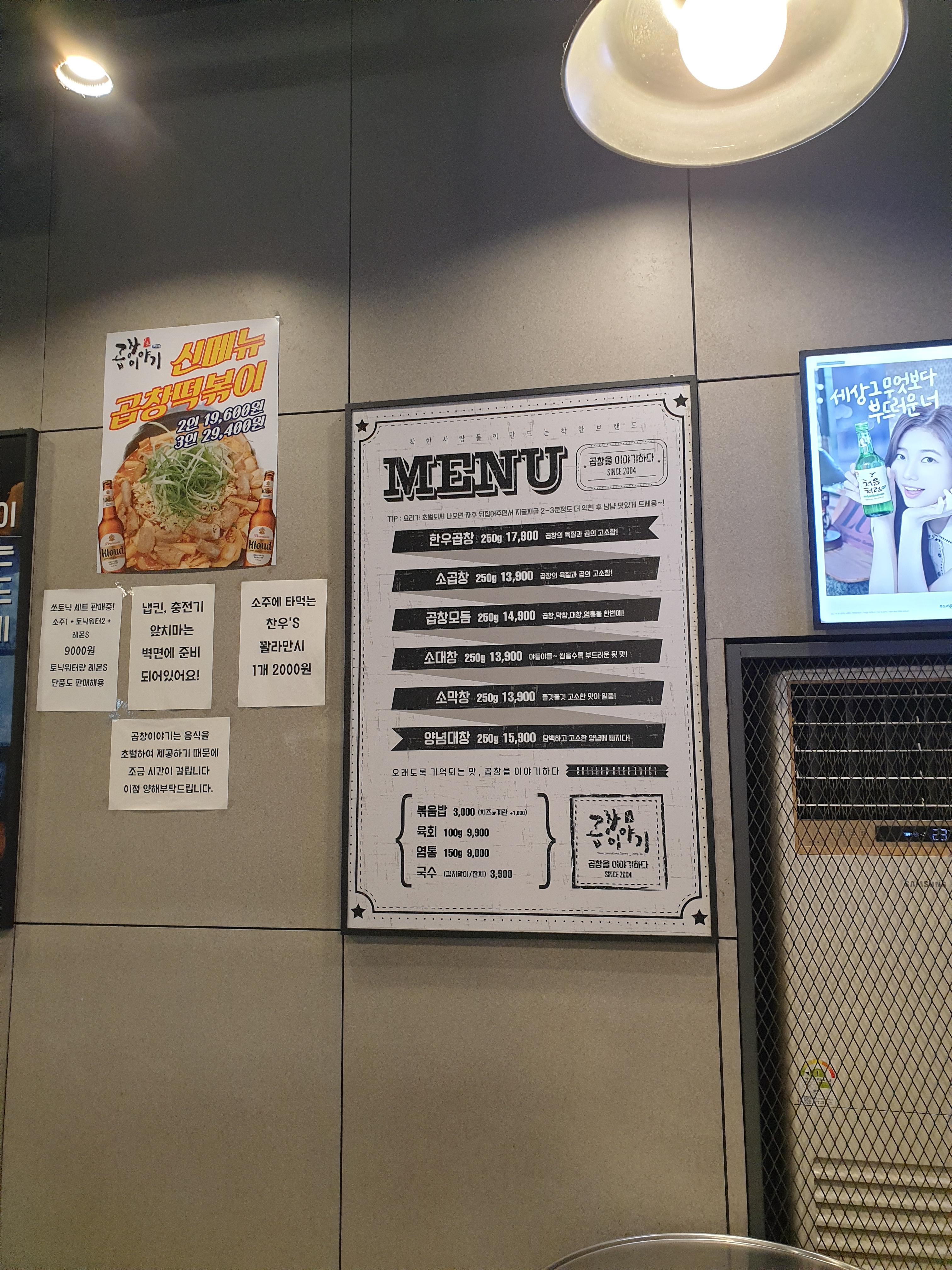 윤두준이 배부른 소리에서 곱창구워먹는걸 봤더니 곱창이 땡겨서 곱창을 먹으러 가기로 했다 장소는 곱창모듬 2인으로 주문 육회랑 순두부찌개가 먼저 나왔다 곱창이야기는 다른 곱창집들이랑 다르게 에피타이저로 육회를 준다 초벌해놓은 곱창이 나왔다 염통+곱창+막창+대창 조합 곱창 교과서 조합이라고 할 수 있겠다 흰색가루가 짭조름하니 맛있다 둘이서 2인분 먹었는데 배가 불러서 볶음밥은 못했다...